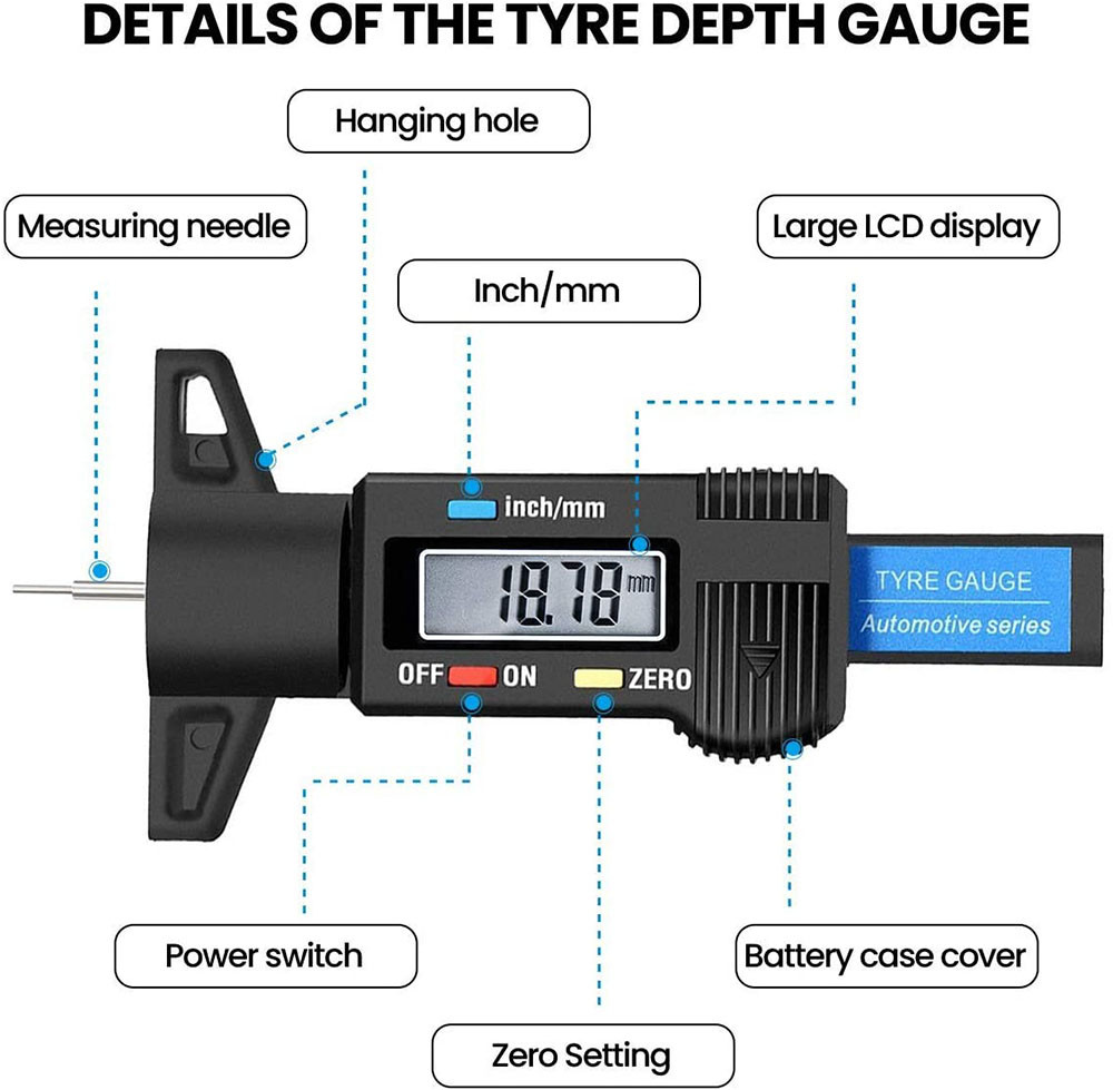 The tyre tread depth gauge: Accurate tyre depth gauge could examine a range of 0-25.4mm/1inch depth with 0.01mm accuracy.